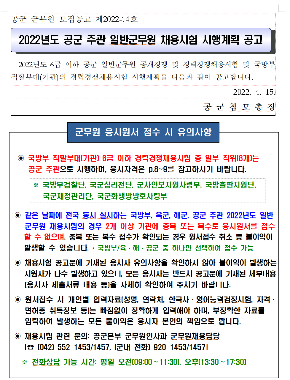 2022년도 공군 일반군무원 채용시험 시행계획 입니다.