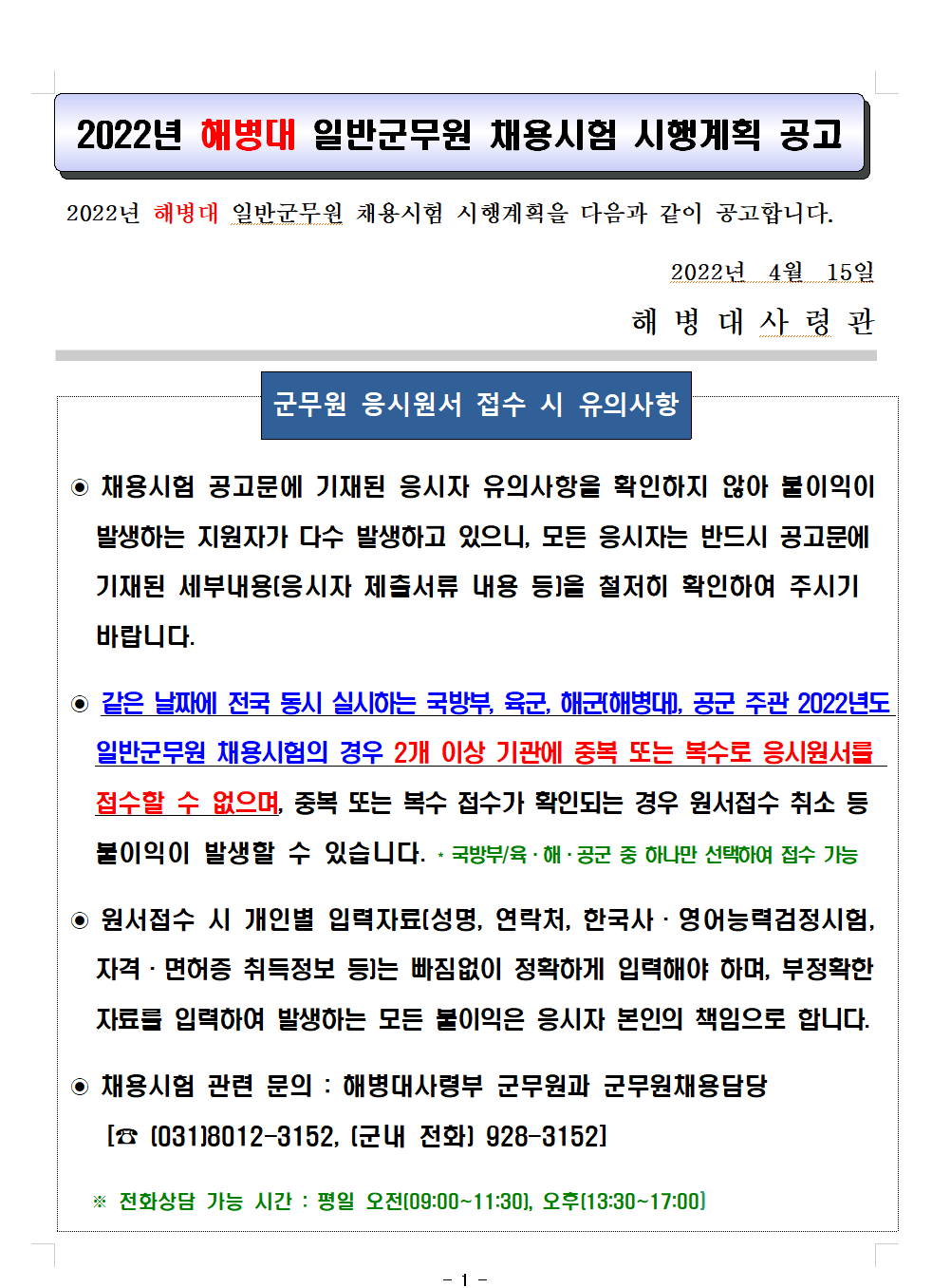 아래의 파일을 다운로드 하셔서 정보 얻으시면 됩니다.2022년 해병대 일반군무원 채용시험 시행계획 공고.hwp0.51MB