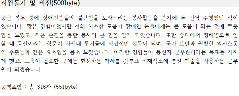-> 지원동기 및 비전의 경우에는 어떠한 군무원이 되고 싶은지에 대한 결론을 생각해 보고 대학시절이나 본인의 삶에서 결론으로 도출하고 싶은 것에 대한 경험을 녹이는 것이 가장 효과적일 수 있다. 또한 군부대 특성을 고려해서 군부대에서 장점으로 부각이 될 수 있는 것들이 있다면 비전을 같이 제시해주면 좋다.