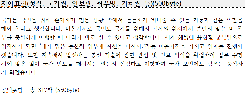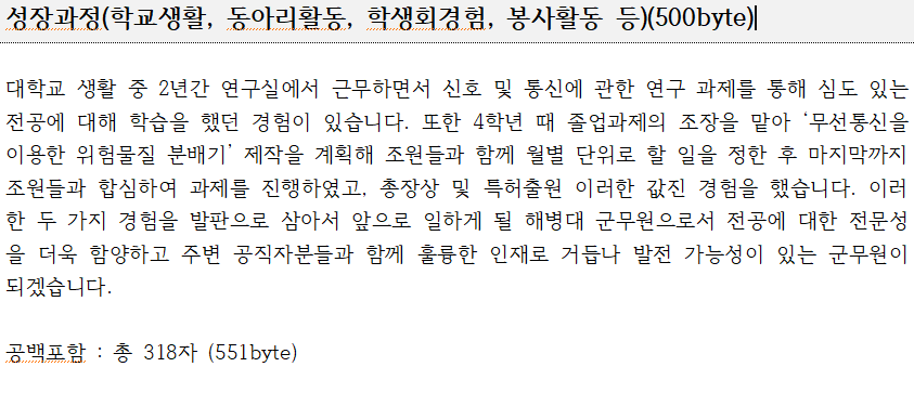 ->성장과정은 예시로 나와있는 것들(학교생활, 동아리 활동, 학생회 경험, 봉사활동 등) 중에서 본인이 직접 경험한 그리고 스토리를 가장 잘 이끌어 낼 수 있는 소재를 선정해서 작성하면 좋다. 나 같은 경우는 대학교 졸업작품을 특허 출허라는 결과까지 이끌어 냈던 소재를 가지고 글을 썼는데, 통신직렬과 관련도 있으면서 나의 전문성을 살릴 수 있었기에 선택했었다.3. 자아표현