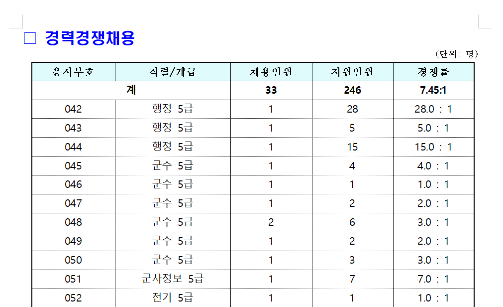 아래에 첨부해 드린 파일을 참고하셔서 필요한 직렬 경쟁률 확인하시면 됩니다.
