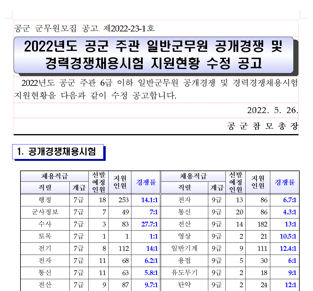 공고22-23-1 2022년도 공군 주관 일반군무원 공개경쟁 및 경력경쟁채용시험 지원현황(경쟁률) 수정 공고.hwp0.10MB
