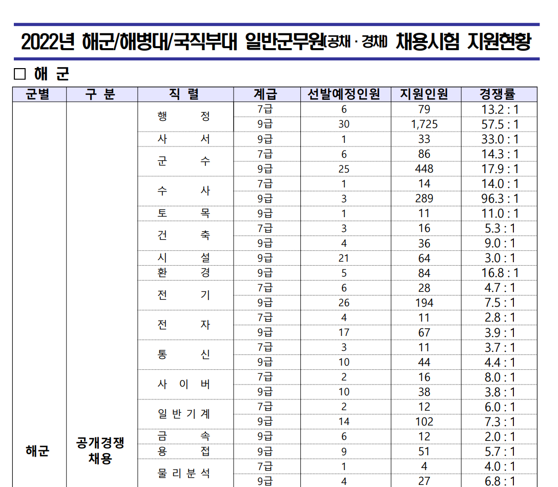 2022년 해군/해병대 군무원 경쟁률(공채/경채) 입니다.