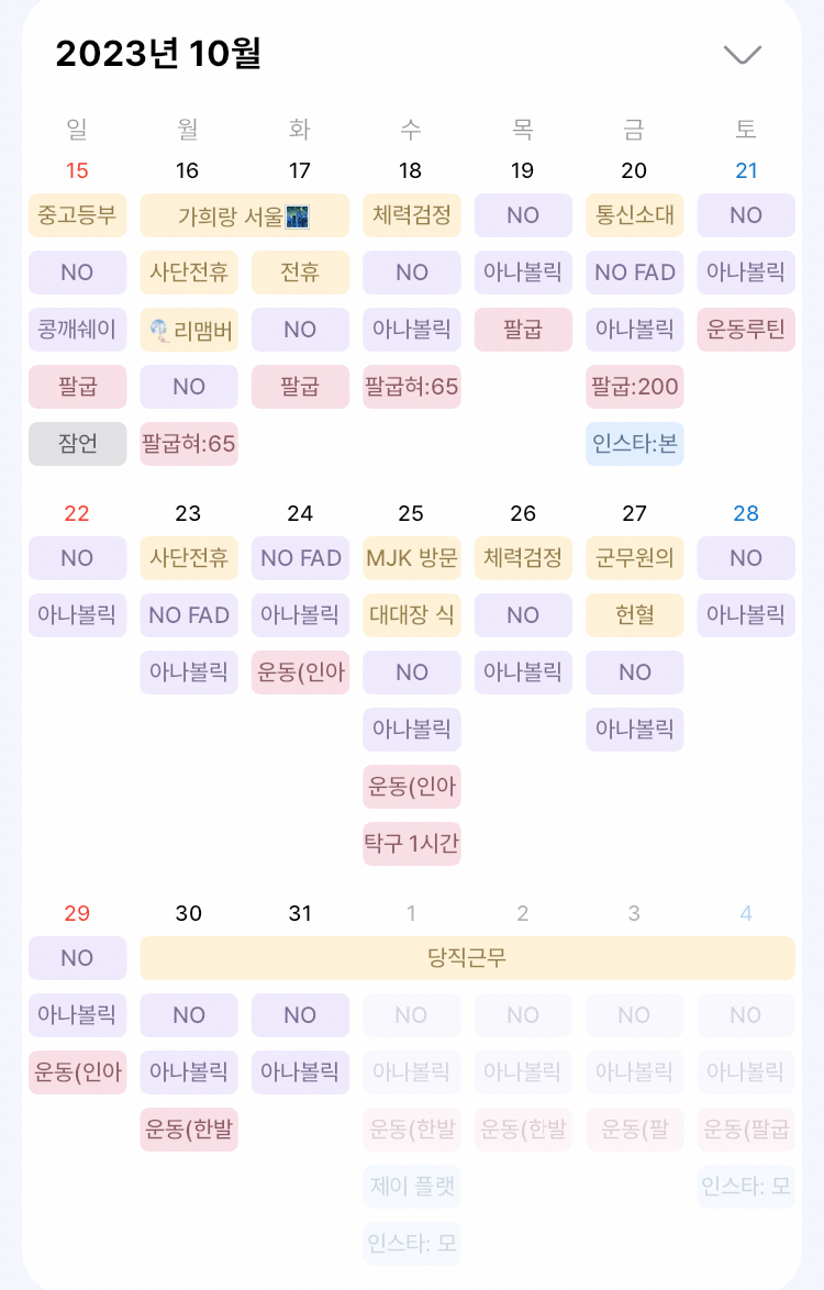 그리고 나름대로 10월에는 이어서 계속해서 운동을 하려고 애쓴 날이 많았던거 같다. 18 ~20일은 사격과 훈련일정으로 부대에 있었던 터라 운동이 어려웠고, 말도 일정도 있었다.