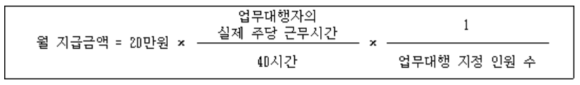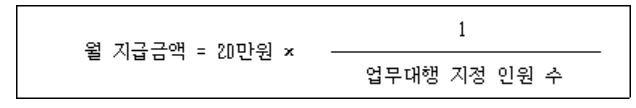① 지방공무원 임용령 제38조의16제2항에 따라 병가, 출산휴가, 유산휴가, 사산휴가 또는 육아휴직 중인 공무원(병가, 유산휴가 및 사산휴가의 경우에는 30일 이상 병가 또는 휴가를 사용하는 공무원으로 한정한다)의 업무를 대행하는 공무원에게는 예산의 범위에서 월 20만 원의 업무대행수당을 지급한다. 다만, 같은 업무를 대행하는 공무원이 여러 명인 경우 업무대행수당은 다음 계산식에 따라 지급한다.