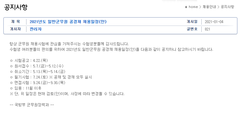 수험생 여러분들의 편의를 위하여 2021년도 일반군무원 공경채 채용 일정(안)을 다음과 같이 공지하니 참고하시기 바랍니다.