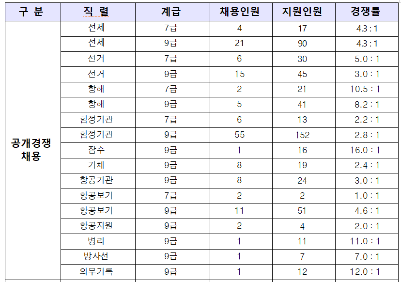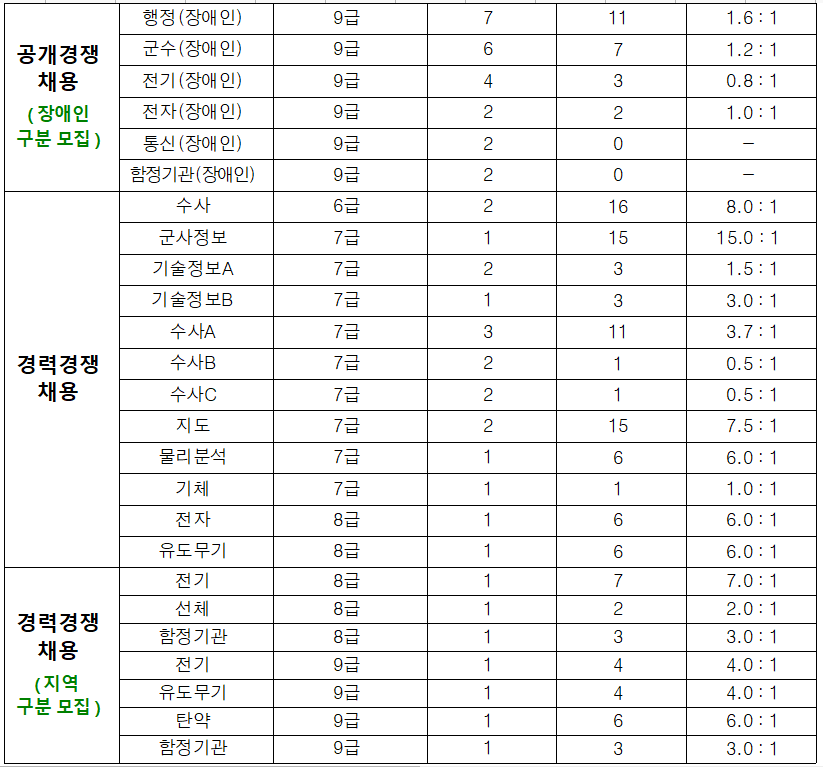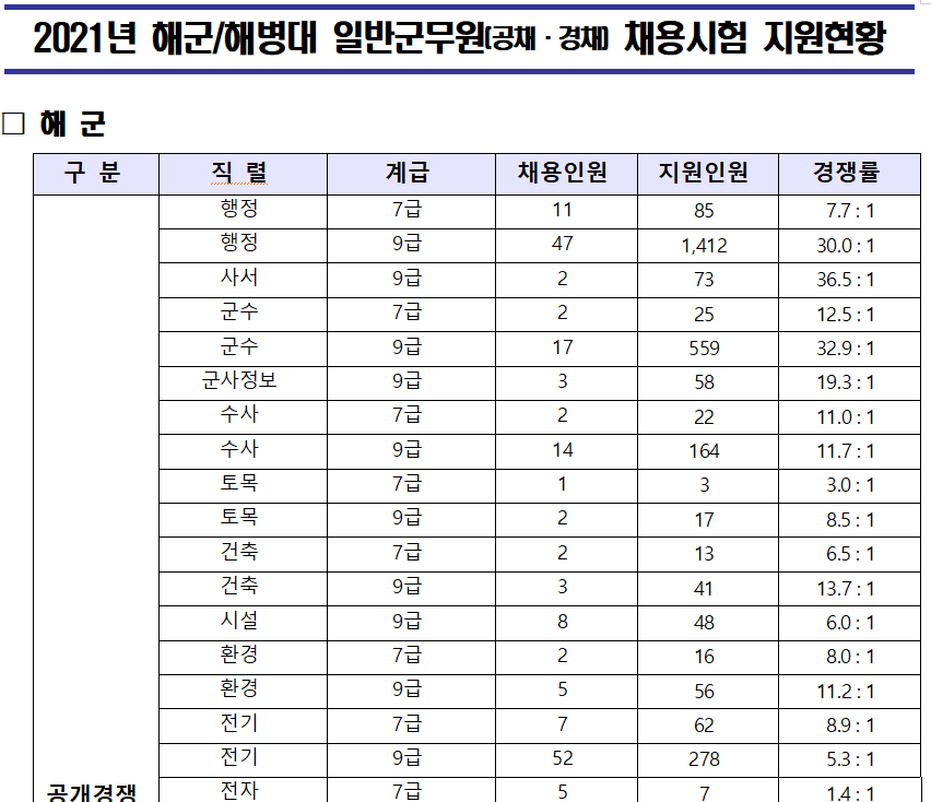 2021년도 해군 군무원 경쟁률 [공채/경채] 입니다.