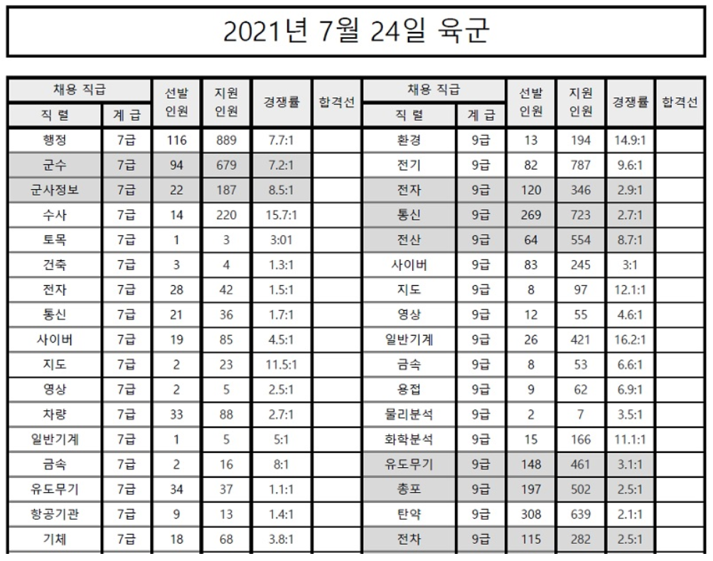 2021년 육군 일반군무원 경쟁률입니다. 따로 다운로드 파일은 없습니다.