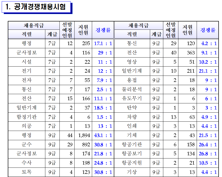 아래의 파일을 다운로드하셔서 정보 얻으시면 됩니다.[경쟁률] 2021년도 공군 주관 일반군무원 공개경쟁 및 경력경쟁채용시험 지원현황(경쟁률) 공고.hwp0.02MB