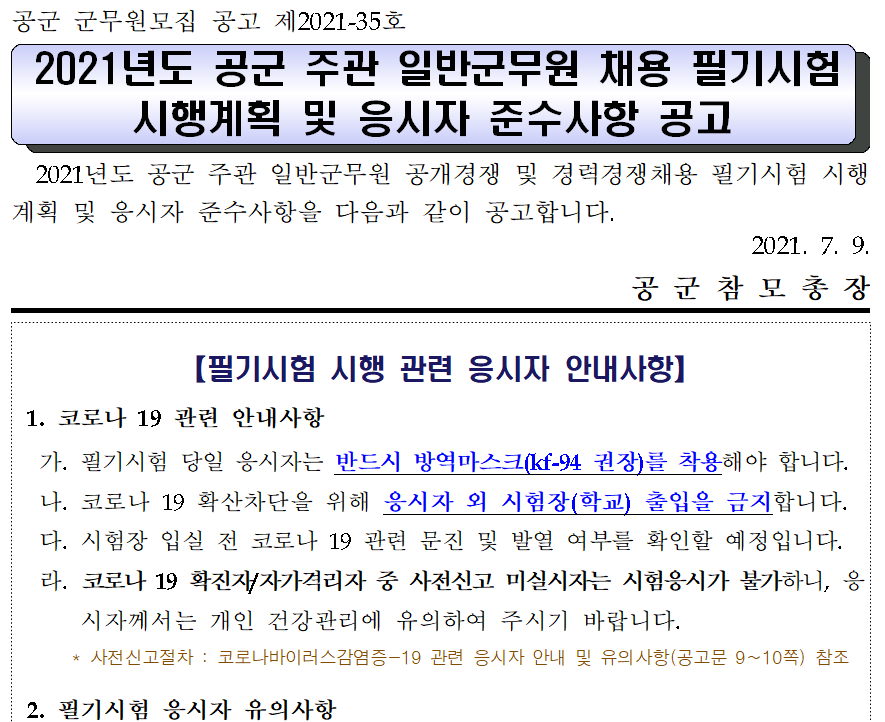 공고21-35+2021년도+공군+주관+일반군무원+채용+필기시험+시행계획+및+응시자+준수사항+공고.hwp0.11MB공고21-35+2021년도+공군+주관+일반군무원+채용+필기시험+시행계획+및+응시자+준수사항+공고.pdf1.02MB