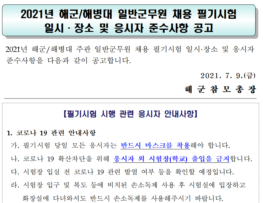 2021년 해군 일반군무원 채용 면접시험 계획공고 (0) 2021.09.14 2021년 해병대 일반군무원 채용 면접시험 계획공고 (0) 2021.09.14 2021년 육군 일반군무원 시험장소 공고[공채/경채] (0) 2021.07.09 2021년 국방부 일반군무원 시험장소 공고[공채/경채] (0) 2021.07.09 2021년 공군 일반군무원 시험장소 공고 [공채/경채] (0) 2021.07.09