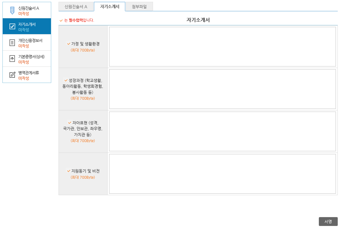 원래의 예전 접수 방법인 등기우편으로 서류를 제출했지만 군사안보지원사령부(www.dssc.mil.kr)에 들어가서 신원구비서류를 제출하도록 좀 더 편리하게 바뀌었기 때문에 하나하나 서류를 뽑아서 보낼 일이 없다는 것이 나름 괜찮았다.주의할 점은 인터넷 익스플로어11버전으로 들어가서 작성을 해야하다는 점이다.
