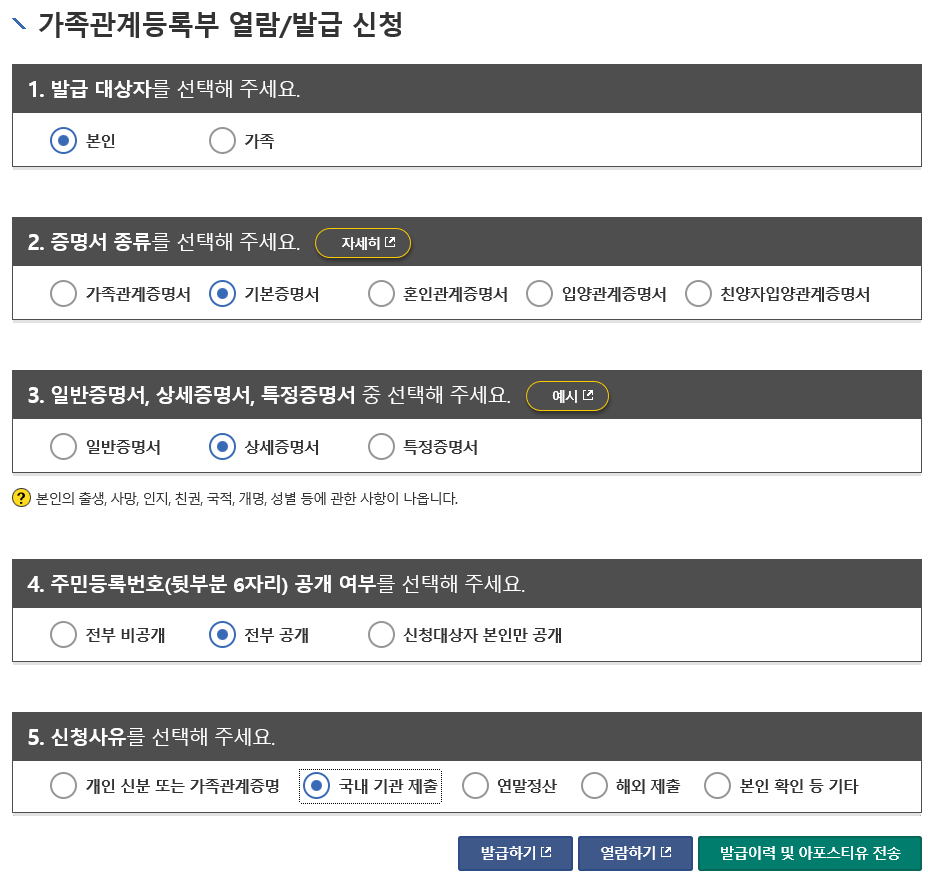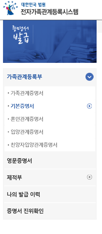 대한민국법원(https://efamily.scourt.go.kr/index.jsp)로 들어가서 가족관계 등록부의 기본 증명서에서 발급! 중요한 점은 상세 증명서로 발급을 받아야 한다는 점과 주민등록번호를 뒷자리까지 공개하여 발급을 받아야 한다. 정부 24로 들어가도 법원 전자 가족관계 등록시스템으로 서버가 연동되기 때문에 바로 법원 홈페이지에 들어가는 것도 하나의 방법이 될 수 있다.