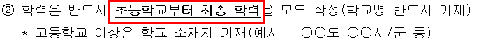 학력사항의 경우는 필수 입력 항목으로 잡혀있지는 않지만 초등학교부터 자신의 최종학력까지 작성을 해주는 것이 좋다. 대학교 같은 경우는 전공학과, 학위를 적을 수 있겠지만 초등학교부터 고등학교까지는 비워놔도 무방할 거 같다. 나 같은 경우는 시작 년월, 종료 년월, 소재지 3가지 항목은 작성을 했다.