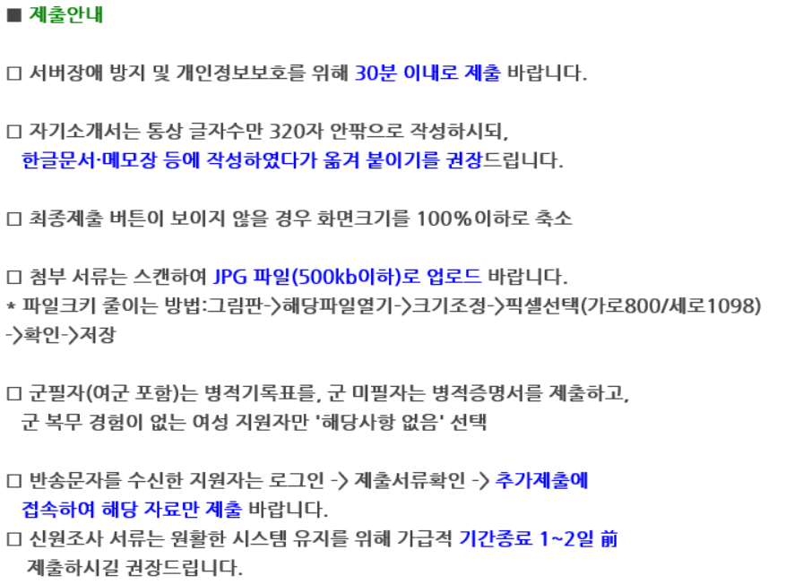 으로 되어 있기 때문에 각 항목별로 필요한 내용 및 자신이 기술할 내용을 320자 이내로 작성해 주는 것이 좋다. 사람인이나 네이버를 통해서 글자 수 확인 및 맞춤법을 체크하고서 복사 및 붙여 넣기를 해주면 빠르게 자기소개서 항목을 끝낼 수 있다. 로그인 시점부터 30분 이내에 작성을 하지 않을 경우 보안 시스템에 의해서 자동 로그아웃이 되기 때문에 자기소개서 항목은 복사 붙여 넣기를 필수적으로 해줘야 한다.