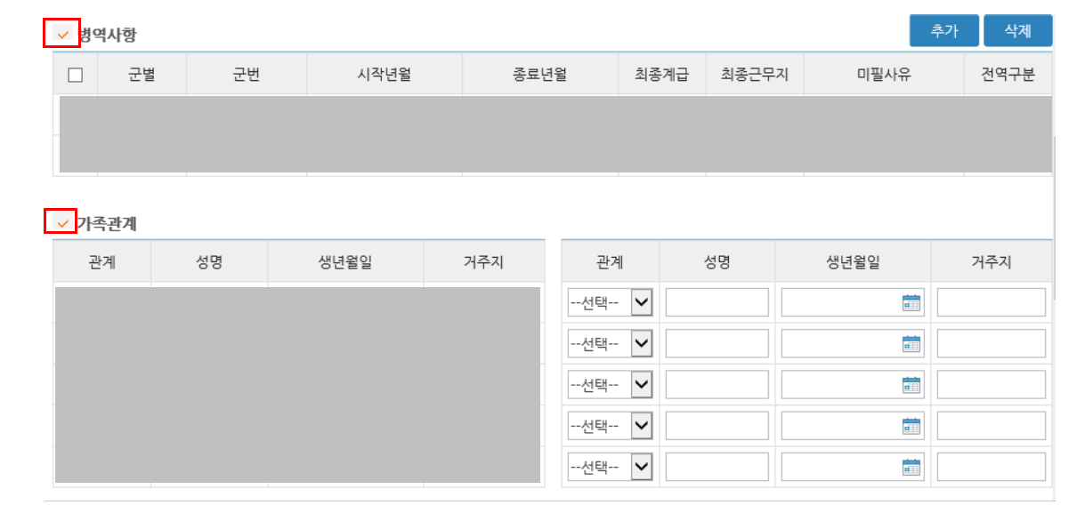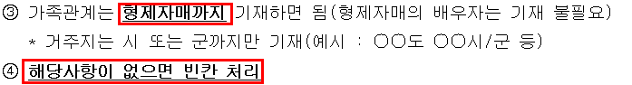 병역 사항은 자신의 병적 기록표나 병적 증명서에 나와있는 대로 항목에 맞춰서 작성을 해주는 게 가장 정확하고 문제가 안 생기도록 하는 방법이다. 적는 항목들에는 군번, 시작 년월, 종료 년월, 최종 계급, 최종근무지, 미필 사유, 전역 구분이 있다. 또한 가족관계는 아래에 첨부한 참고사항을 확인하면서 작성하면 된다.