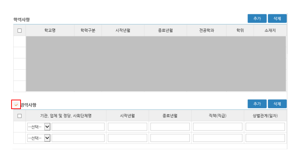 경력사항은 있는 사람의 경우는 위와 동일한 방법으로 시작 년월, 종료 년월, 직책, 상벌관계를 적어주면 되고, 경력사항에 해당이 되지 않는다면 선택에 들어가서 해당사항이 없다는 체크를 해줘야 한다.