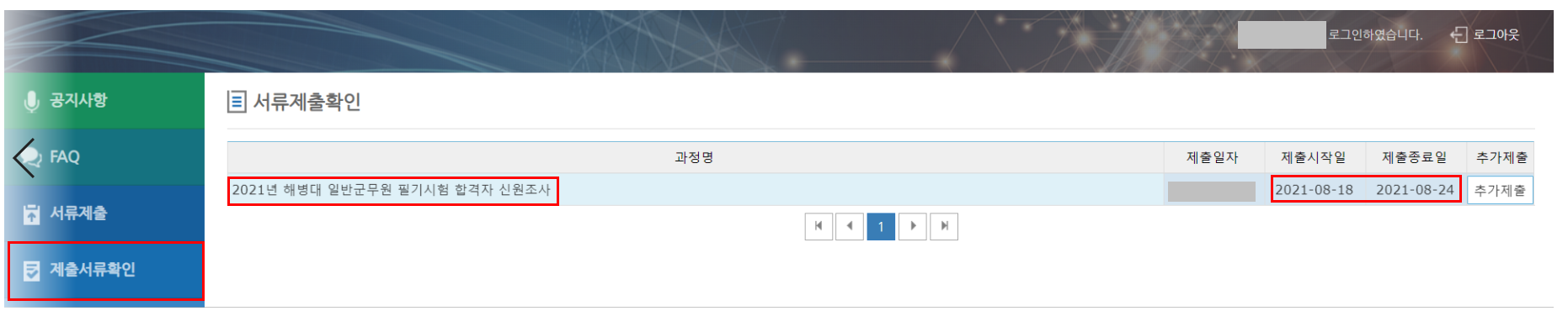 위에 명시한 5가지 항목을 '작성' 상태로 잘 넘어온 후에 오른쪽 상단에 있는 '제출' 버튼을 눌러주면 완료가 된다. 마지막에'제출서류 확인'을 들어가서 본인이 제출한 날짜를 확인하기만 하면 끝이다.