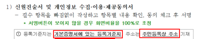 성명(한글, 한자) / 주민등록번호 / 등록기준지(기본증명서에 나와있는 기준 등록지를 작성) / 주소 / 휴대폰 번호 / 국적 관계 / 국가명은 체크 사항이고 정확하게 기입하라고 한 부분이기 때문에 필히 작성을 해줘야 한다.