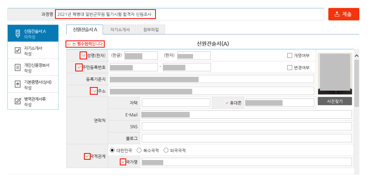 군사안보지원사령부 홈페이지(www.dssc.mil.kr) 접속을 한 후에 서류제출을 클릭한 후에 인증을 하고 들어가면 맨 먼저 자신의 어떤 과정(지원)의 필기시험을 통과했는지 선택을 해야 한다. 나 같은 경우는 해병대 일반 군무원 9급 공채를 지원했기 때문에 '과정명: 2021 해병대 일반 군무원 필기시험 합격자 신원조사'를 클릭한 후에 서류 작성을 진행했다.