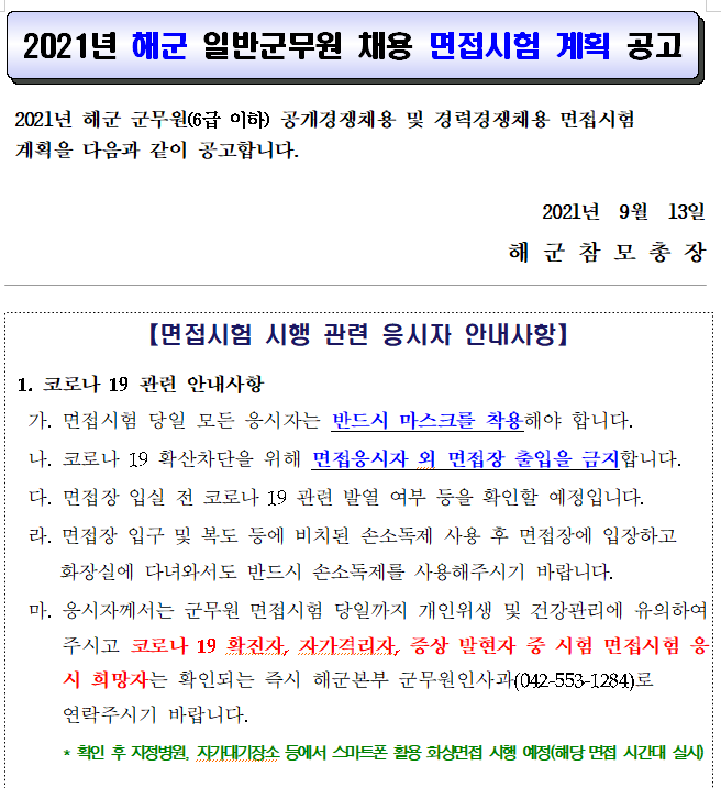 2021년 육군 6급이하 일반군무원(공채) 행정9급 면접일정 수정 공고 (0) 2021.09.14 2021년 국방부 주관 일반군무원 채용면접시험 계획 공고 (0) 2021.09.14 2021년 해병대 일반군무원 채용 면접시험 계획공고 (0) 2021.09.14 2021년 해군/해병대 일반군무원 시험장소 공고[공채/경채] (0) 2021.07.09 2021년 육군 일반군무원 시험장소 공고[공채/경채] (0) 2021.07.09