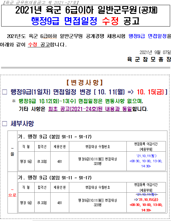 2021년 육군 6급이하 일반군무원(공채) 행정9급 면접일정 수정 공고[핵심] 군무원 합격 치트키/군무원 정보 2021. 9. 14. 13:10728x90반응형SMALL728x90반응형LIST