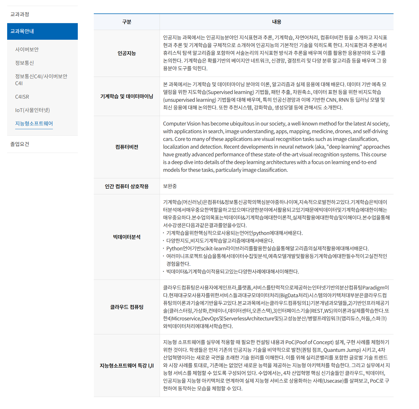 나의 경우에는 지능형소프트웨어를 선택했는데, 내가 하고 있는 업무와의 연관성도 가장높고 추후에 나의 업무 선택의 폭을 넓힐 수 있는 학과이기 때문에 선택했다.