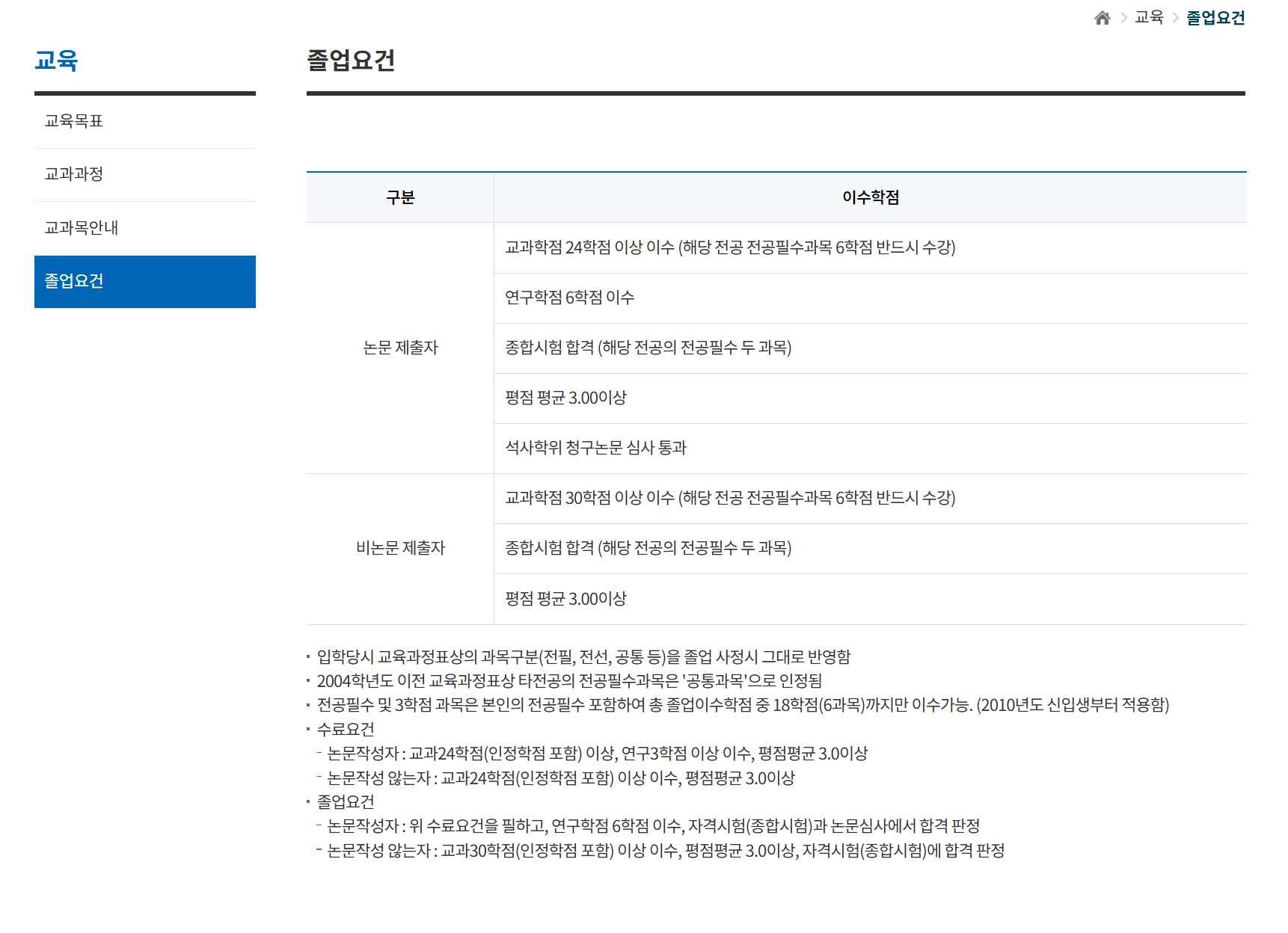 (교육목표 / 교육과정 / 교과목안내 / 졸업요건)